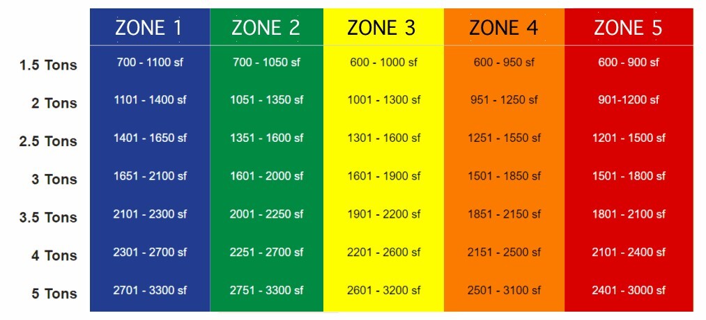 Select the A/C unit size (tonnage) that corresponds to your square footage and zone for optimal efficiency.